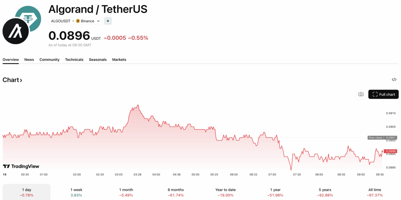 For ALGO price action, the math is straightforward but brutal. The token is changing hands around $0.09, a level that serves as critical support.