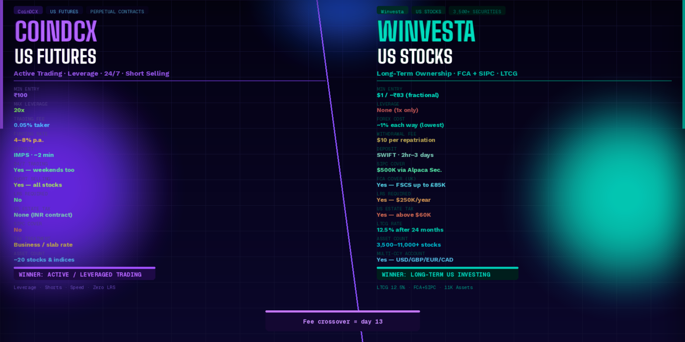 | Quick Answer: Winvesta wins for long-term investors who want the widest US asset universe (3,500–11,000 stocks & ETFs), the lowest forex cost (~1%) of any LRS platform, dual FCA + SIPC regulation, and LTCG at 12.5% after 24 months. CoinDCX wins for active traders who need leverage, short-selling, 24/7 access, or want to skip LRS/TCS entirely. The cost crossover lands at approximately 13 days — before that CoinDCX is cheaper, after that Winvesta’s flat FX beats compounding funding charges. |