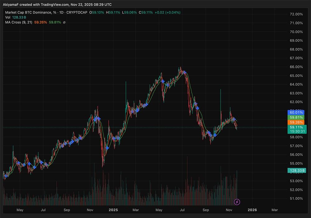 BTC dominance has slipped about 4% and is forming a death cross, which lines up with what we’ve been seeing from altcoins. Other BTC pairs snapped back from their October lows.