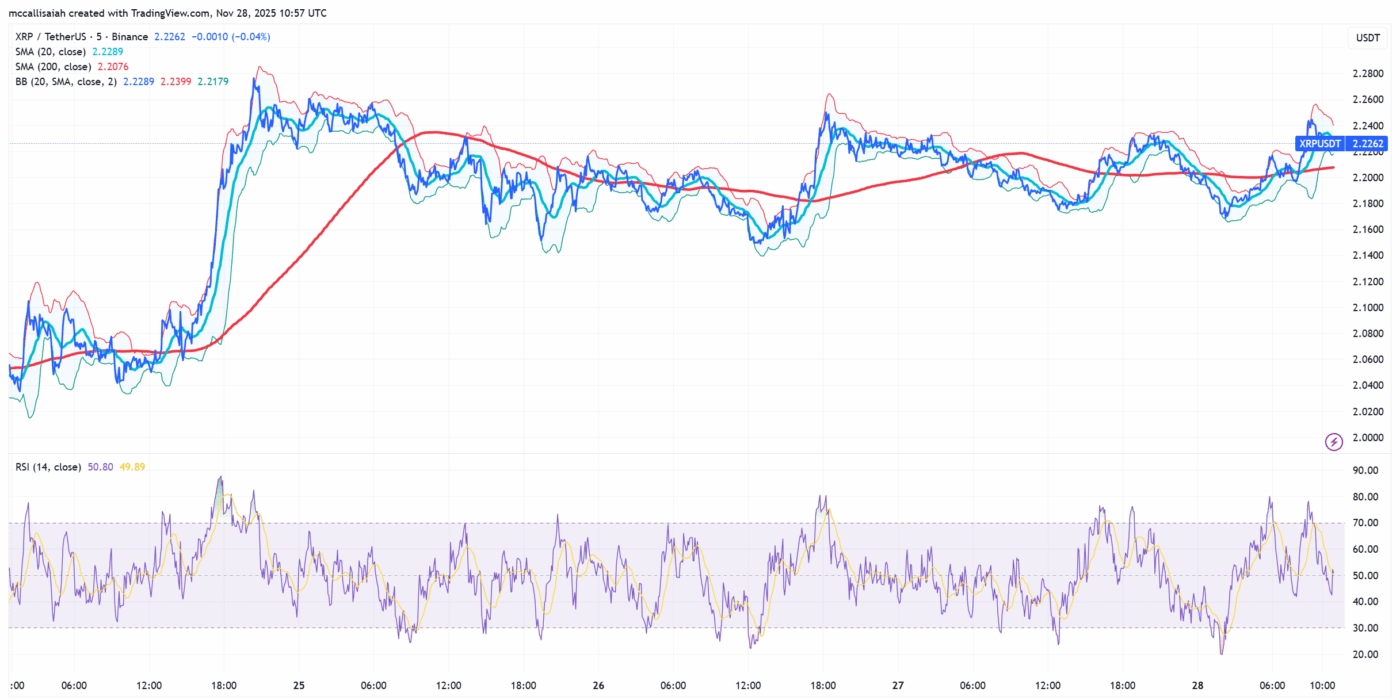 XRP USD enjoyed a clean push above $2.20, briefly tagging $2.286 before momentum cracked. The rejection coincides with a bearish trend line sitting at $2.225 and growing hesitation around $2.250, a level that has repeatedly capped upside attempts.