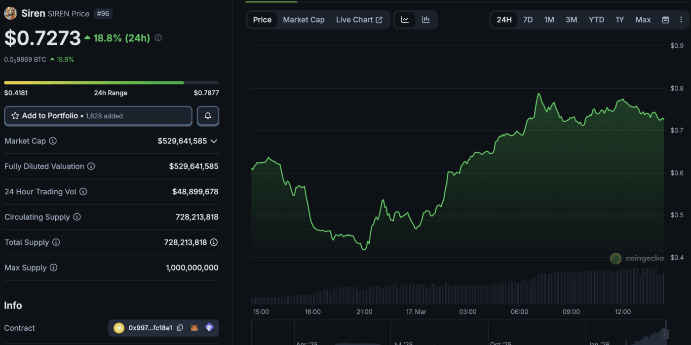 SIREN crypto has emerged as a standout performer in a choppy market, surging above the $0.70 level while major caps struggle for direction. The BSC-based token is currently trading over $0.72, posting a volatile 24-hour performance that has seen it top daily gainer lists.